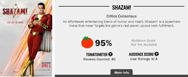 DC大片《雷霆沙赞》将于4月5日清明节在大陆上映,这部电影的投资成本是目前DC宇宙最低,仅有不到9000万美元,日前解禁的口碑却成为了DC最高,烂番茄新鲜度95%,MTC79分,超过《神奇女侠》(烂番茄93%,MTC76分)的口碑破DC宇宙最高纪录。
