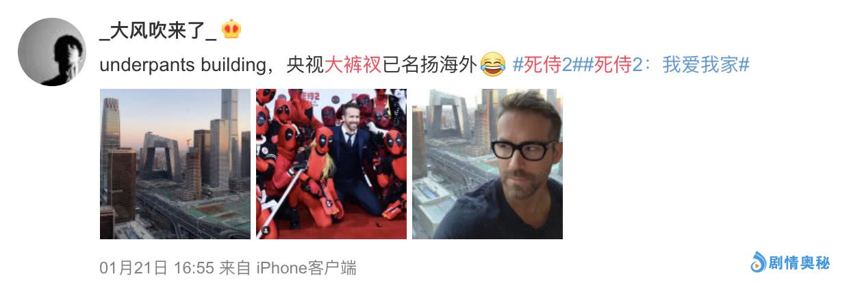 健身房的外景着实让人羡慕,已经成为北京地标性建筑的央视大裤衩就在窗外一览无余。扎克瑞一边健身还不忘跟网友打卡看到大裤衩,颇有些游客到此一游的模样。有趣的是瑞恩·雷诺兹来北京宣传《死侍2:我爱我家》时也po出过角度差不多的大裤衩楼,莫非两位超能力者入住的是同一家酒店?