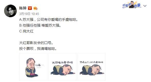 连着写了苏大强这么多热搜,可见大家对于大强是真喜欢,陈坤还专门发了一条微博让网友票选影友会口号。