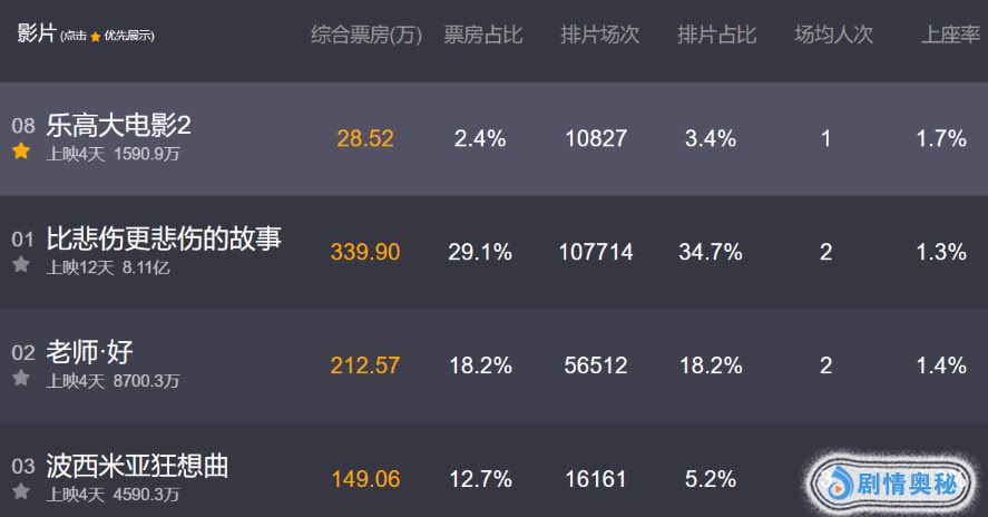 《乐高大电影2》内地首日票房才205万。在周末这个动画片有优势的时间段,日票房也在600万左右。日票房排名已经下跌到了第8名。截至11点该片25号日票房才28.52万,排片只有3.4%,票房占比2.4%。累计票房只有1590万。基本宣告了电影在内地市场的失败
