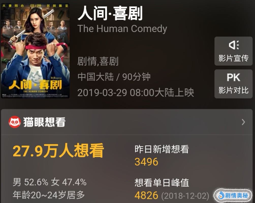 其中,《人间·喜剧》将于3月29日上映,这部电影在猫眼的想看人数已经达到了27.9万人。