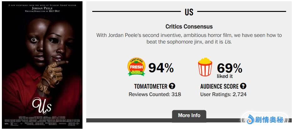 《我们》的口碑爆棚了,烂番茄新鲜度高达94%新鲜度,这么炸裂的口碑票房后劲应该不会差,从它挑落漫威大片就能看出实力。该片北美本土的口碑很好,不过在海外口碑却一般,如在香港口碑就扑街,观众只打出3.4分(满分5)。文化上的差异从它的海外票房也体现出来了,海外周末仅收1670万美元,这下票房要靠北美贡献了。