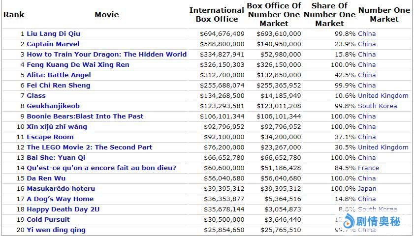 《惊奇队长》上映3周全球破9.1亿美元,暂排2019年度票房冠军。其中北美3.21亿美元,排名北美年度冠军,海外5.88亿美元,排名海外榜亚军。漫威新片的海外票房还落后《流浪地球》,该片凭借中国市场大爆狂收了6.94亿美元,吴京勇夺海外冠军。