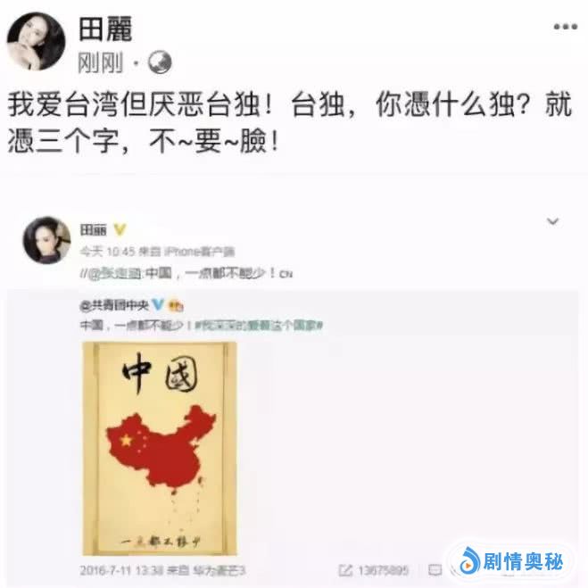 最帅气的是,田丽是少数在facebook、微博等多个社交平台,公开大骂台独的台湾艺人。