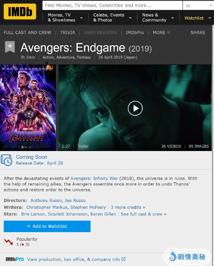 即将于北美时间4月26日上映的《复仇者联盟4:终局之战》终于曝光了电影的官方最终时长,此前的传言是真的!根据AMC官方以及IMDb显示确认,《复仇者联盟4:终局之战》的时长是182分钟,也就是3小时2分钟!