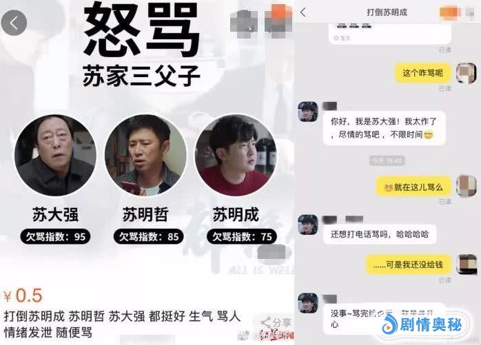 有人在某宝开了“怒骂苏家三父子”的网络店铺,一次仅需0.5元,一周下来已有300多人购买,有的买家还特意留言“太解气了”、“客服态度很好,让我体验了下当大爷的感觉”。
