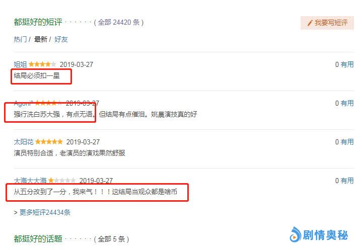 但是,随着该剧的热播,剧情的一步步深入发展,口碑上却出现了两极化,从豆瓣开画的8.5分,跌至到了结局的7.9分,成为了众多观众口中的“烂尾剧”。结尾中的剧情的确催人落泪,苏明成像苏明玉道歉,两人和好如初,转身离开之际两人相继眼眶湿润。患了老人痴呆的苏大强在除夕之夜不忘为女儿买习题集一幕不仅令苏明玉痛苦流泪,更是赚足了观众泪点。但是强行洗白苏大强的结尾似乎有点不合常理,从而引发了众多网友的热议。