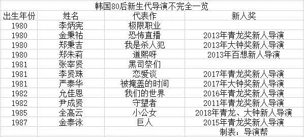 而早在2013年因一部商业制作《恐怖直播》(豆瓣8.7)惊艳业内外的金秉祐近年来鲜有好作品出现。同理,还有拍出话题之作的《道熙呀》的郑朱莉,这部处女作也是她最新的作品,图表中最年轻的金泰泳的履历也停留在了2016年的作品《女教师》。