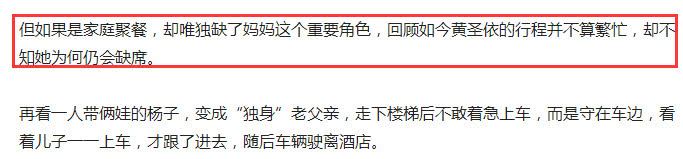 3月25号时,有媒体曝光了杨子独自带娃的画面,妻子黄圣依缺席家庭聚餐。摄影师表示黄圣依如今工作根本不算忙,不知道她为什么会缺席家庭聚会。事实上,网上一直流传着黄圣依和杨子感情变淡的传闻,不知是真是假。