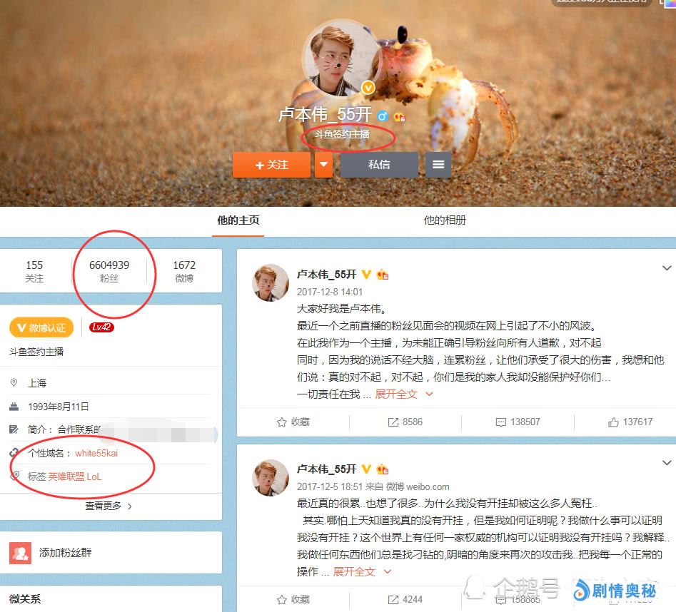 这四点已经是充分的说明了,卢本伟的自从封禁了之后,微博仍然还挂着斗鱼签约主播,粉丝的数量如今更是达到了660w,单单是这两点还不能够令人信服,但斗鱼官方在3月24日晚的20.11分发表了一条空白消息,这个瞬间的炸锅了!空白=white=五五开!