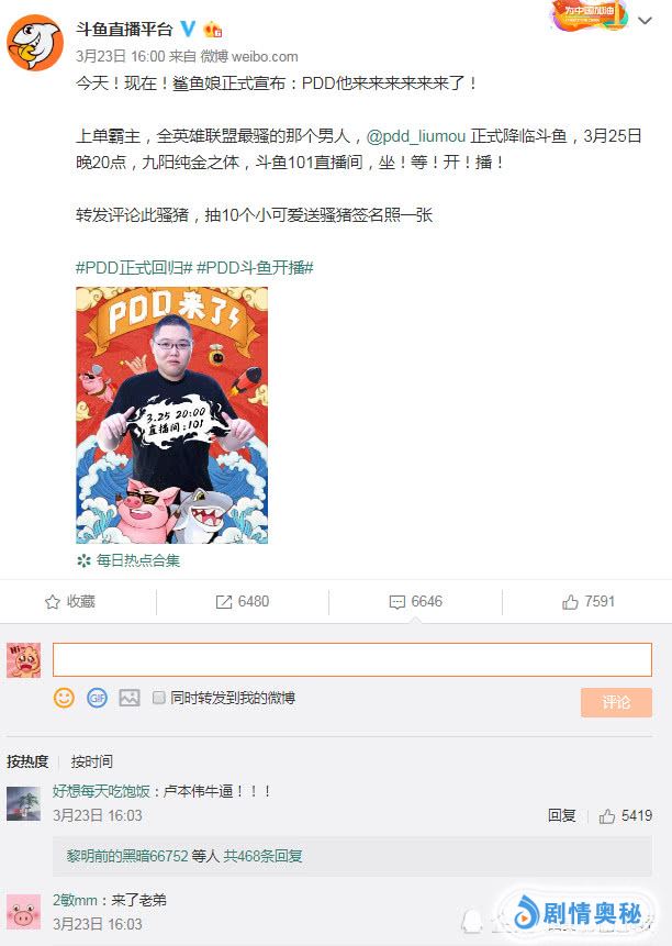 PDD已经是正式的回归了斗鱼直播,LOL的顶级主播之一终于回归了一位,玩家已经是按捺不住自己的心情喜悦一番了!PDD一回归,玩家们迅速地疯狂了一般,但PDD都已经回归了,那么卢本伟,卢姥爷还是远吗!已经不远了!大家一直希望卢本伟回归,消息已经是确定了将要回归!