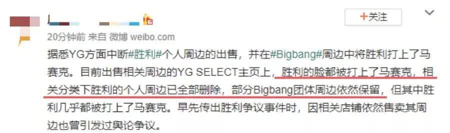 但由于李胜利这桩丑闻影响实在太大,甚至惊动了韩国总理,下令要求严查此事,于是YG中断了李胜利个人周边的出售,并在团队合照中,给李胜利打上马赛克。