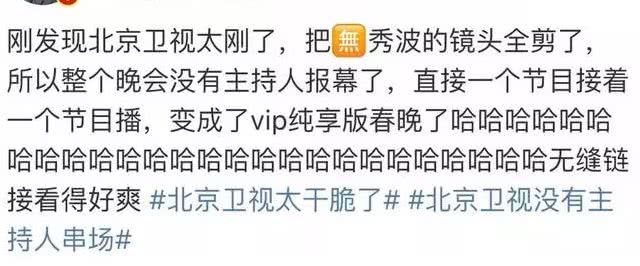 可除此之外,吴秀波还参与北京台春晚的录制,而且还是节目主持人,如果非要把他P掉,整个晚会的主持环节都会乱套。于是硬核北京台直接把所有主持人串场全剪光了,报幕全靠右上角角标提醒,这么一来,既能解决吴秀波这个问题,又不影响晚会。
