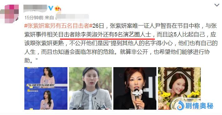 张紫妍陪睡案唯一目击证人尹智吾是最勇敢的,她是第一个站出来的,目前已经把相关事实和真相陈述给了检方和警方,但是她拒绝在新闻直播中透露陪睡名单。3月26号,证人尹智吾表示出了李美淑之外,还有5个娱乐圈目击证人,他们和张紫妍更熟悉,不公开这五个人名字也是有原因的。