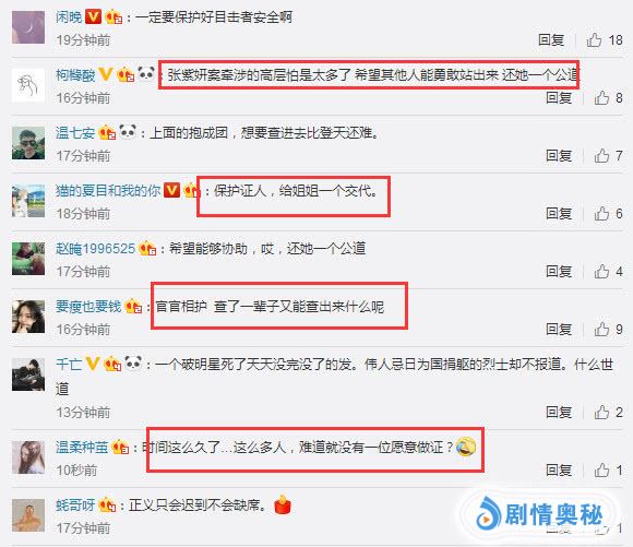 网民纷纷留言:总有轮回,伤天害理的事做了,总会到自己头上!一定要保护好目击者安全啊!张紫妍案牵涉的高层怕是太多了,希望其他人能勇敢站出来,还她一个公道!上面的抱成团,想要查进去比登天还难!官官相护,查了一辈子又能查出来什么呢?时间这么久了……这么多人,难道就没有一位愿意作证?