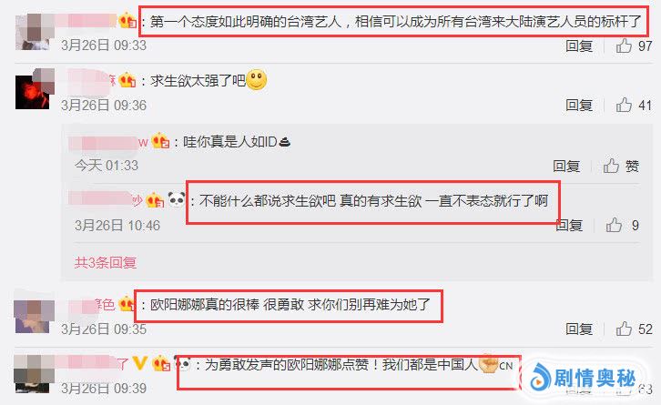网友评价说:第一个态度如此明确的台湾艺人,相信可以成为所有台湾来大陆演艺人员的标杆了!不能什么都说求生欲吧,真的有求生欲,一直不表态就行了啊!欧阳娜娜真的很棒,很勇敢,求你们别再难为她了!为勇敢发声的欧阳娜娜点赞,我们都是中国人。