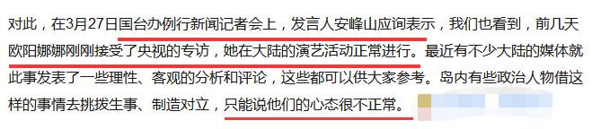 3月27号,国台办举办新闻记者会,有记者询问此事,发言人安峰山当场也回应了。他指出:前几天欧阳娜娜刚刚接受了央视的专访,她在大陆的演艺活动正常进行。最近有不少大陆的媒体就此事发表了一些理性、客观的分析和评论,这些都可以供大家参考。岛内有些人物借这样的事情去挑拨生事、制造对立,只能说他们的心态很不正常。
