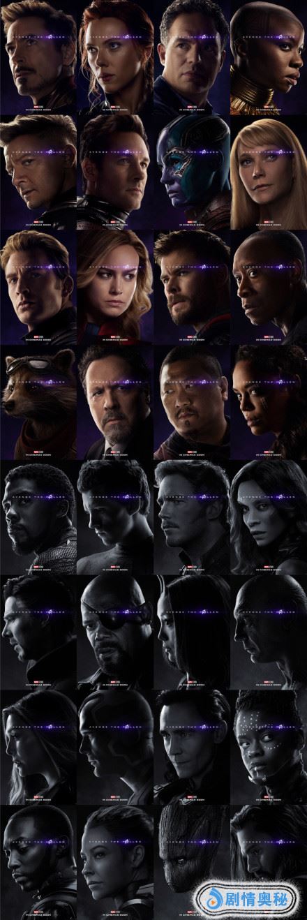 北美公映正式进入倒计时一个月,《复仇者联盟4:终局之战》也爆出了32张极清角色海报为影片上映预热。海报分为16位生存角色和16位消亡角色,生存角色海报为彩色,而在上一部中“化灰”的角色都用了黑白作为主色,实属官方“插刀”,分分钟带你重回上一部的悲惨结尾。