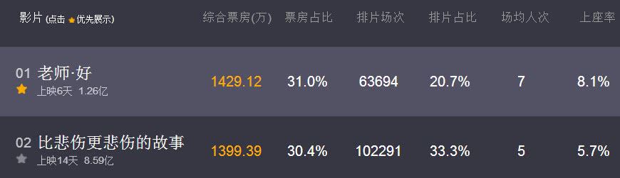 没想到最终还是被《老师·好》逆袭夺冠了,不过两部电影这一天的单日票房相差并不大。《比悲伤更悲伤的故事》在当天也拿下了1399万的单日票房,总体来看只是相差了30万的单日票房,随时都有可能被再次反超,不过这样的成绩对于《老师·好》这部电影来说确实是一个好消息。