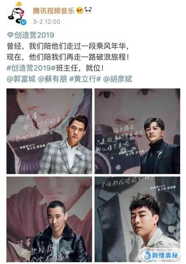 《创造营2019》这一季相比起上一季《创造101》来说整体都出现了很大的改动。这一季除了发起人迪丽热巴之外,其余的四位导师全部性别为男:郭富城、苏有朋、黄立行,加上在创1中沿用的胡彦斌老师,单看导师阵容,这四位导师就在唱歌、跳舞、演戏等方面全面包围起来, 任何一方面的短板都补齐了。网友还调侃说道胡彦斌拉低了导师的平均年龄。这样看,的确,前几位导师都是年龄4、50的有资历老人了,相比起30岁胡彦斌,的确是年轻很多,但丝毫不影响胡彦斌的实力。