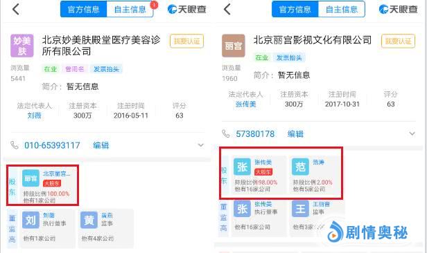 但是,有细心的网友在天眼查查询后发现,当天开业的北京妙美肤殿堂医疗美容诊所有限公司,占股100%的大股东是北京丽宫影视文化有限公司,而占公司98%股份的大股东张传美是范冰冰的母亲。占股2%的股东范涛是范冰冰的父亲。