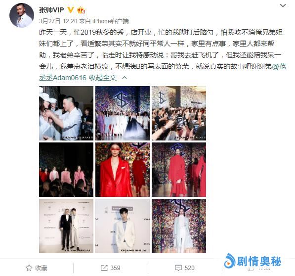 当天12:20,张帅再次发微博,专门对范丞丞表示感谢“我老弟辛苦了,临走时让我特感动说:哥我去赶飞机了,但我还能陪我呆一会儿,我差点老泪横流,不想装B的写表面的繁荣,就说真实的故事吧谢谢弟@范丞丞Adam0616”。两人之前在微博上也多有互动,看来平时关系就比较亲密。