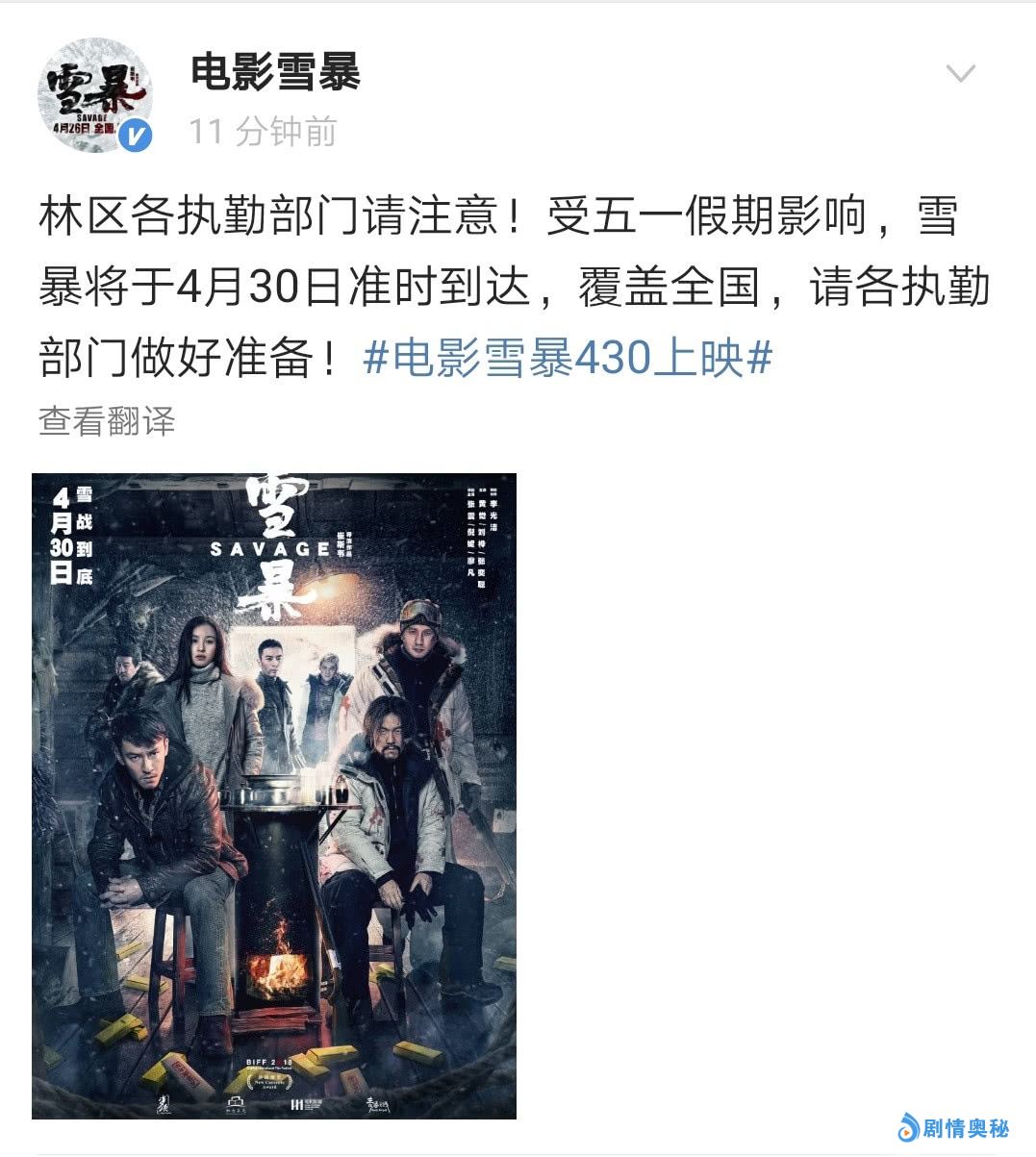 近日,电影《雪暴》官方发布了一条动态,宣布了电影改档的消息,“林区各执勤部门请注意!受五一假期影响,雪暴将于4月30日准时到达,覆盖全国,请各执勤部门做好准备!”。