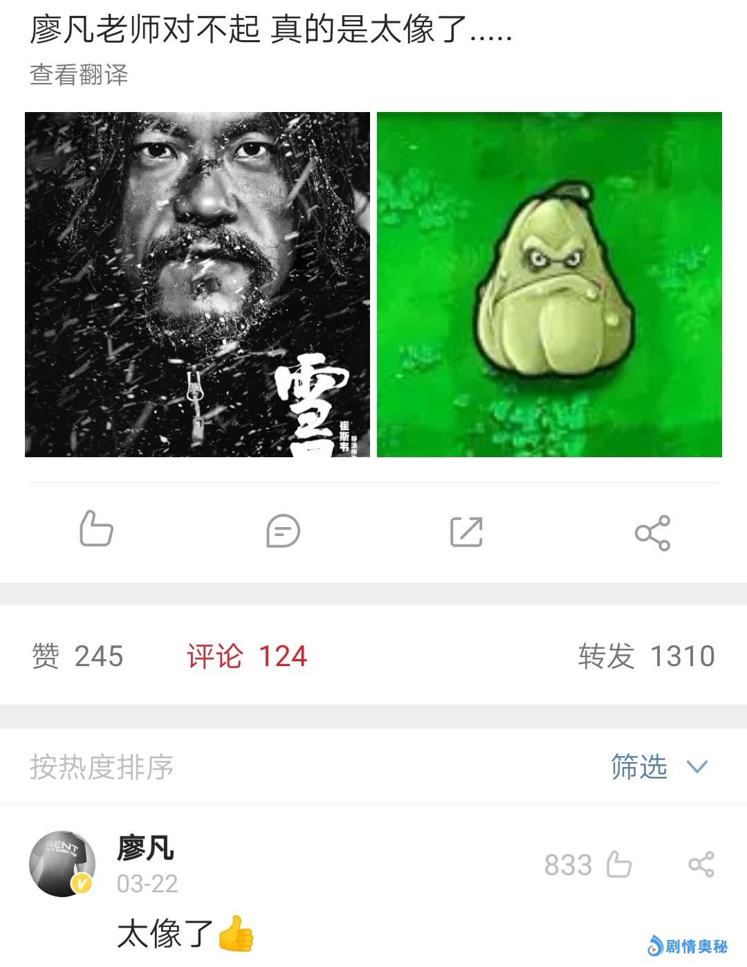 有趣的是,廖凡的这张电影海报还撞脸了“植物大战僵尸”里面的窝瓜,本人也承认“太像了”,堪称完美撞脸。