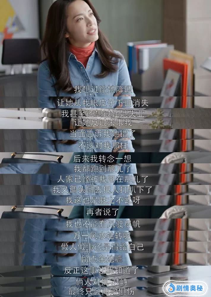 苏明玉在对苏明成的前领导周姐聊天中提到自己当初初入职场因为得罪了上司而被对方穿小鞋,苏明玉后来成为对方的上司的上司,在选择报复还是原谅的时候她有了一番思考,这个想法同样也是结局的另一层解读。
