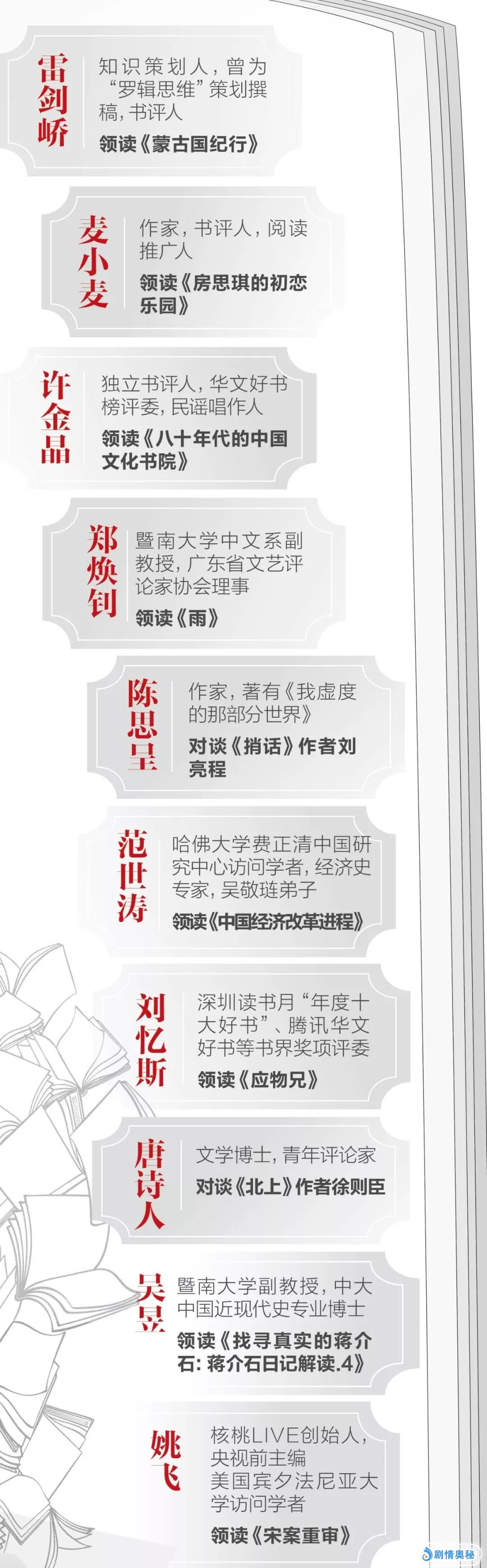 10部入选作品都来自当下最优秀的创作者之手:《北上》作者徐则臣曾获得“鲁迅文学奖”及“老舍文学奖”,《应物兄》作者李洱曾入围“茅盾文学奖”,《雨》作者黄锦树获得了北京大学王默人-周安仪世界华文文学奖,《找寻真实的蒋介石》作者杨天石是在蒋介石研究领域独步学林的学者,《八十年代的中国文化书院》作者陈越光是影响整整一代人的“走向未来丛书”前副主编,《中国经济改革进程》作者吴敬琏更是影响过中国经济发展方向的权威专家……他们的创作品质无不有口皆碑,在行业内外都声望卓著。