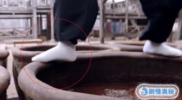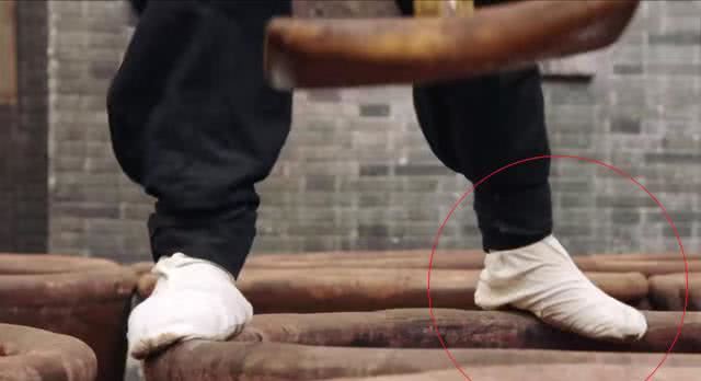 沁芳居开耙的那一天,严振声亲自上阵捣酱。老严在酱缸上跳来跳去,动作十分娴熟。这时,你会注意到老严穿的白色袜子很崭新,等镜头一转,老严脚上的袜子明显不是之前的那一双。难道老严的袜子变松了?