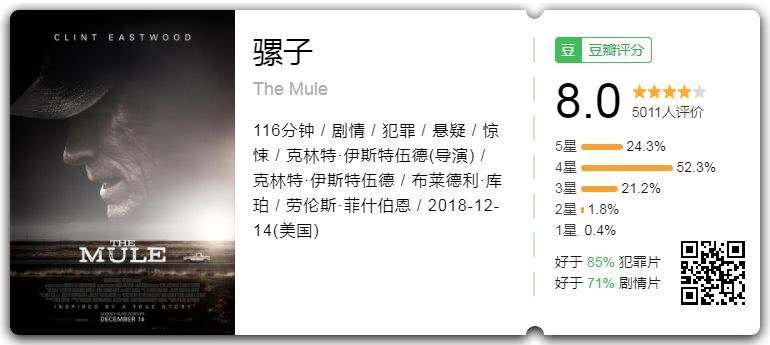 尽管故事不算新颖,但《骡子》依然在各大电影网站取得不俗的成绩。