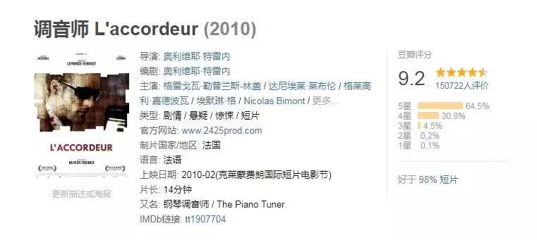 这部影片改编自2010法国的14分钟短片《调音师》,这部短片荣获2011年卢纹(Leuven)国际电影节最佳短片奖、2012年法国恺撒奖最佳短片奖,更是在豆瓣拿下了9.2的高分。
