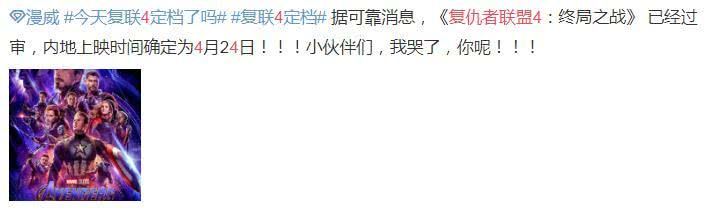 而据最新消息,《复仇者联盟4:终局之战》 已经过审,内地上映时间确定为4月24日,比北美的4月26号还早上映两天,大陆观众终于可以提前一睹芳容了,可喜可贺!此次《复联4》内地上映时间跟香港一致,可见中国市场越来越受重视了,制片方此次选择在中国市场全球首映,相信票房会创造新的奇迹!