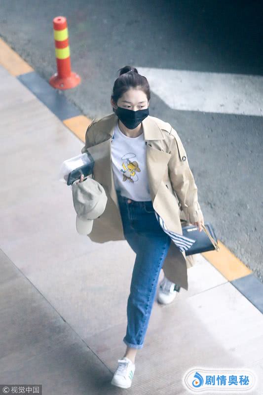 段奥娟的穿搭也是以舒适为主,内搭白色短袖T恤,外面是驼色风衣,左手提着包,右手拿着帽子手机有一个便利盒,走起路来大步流星。