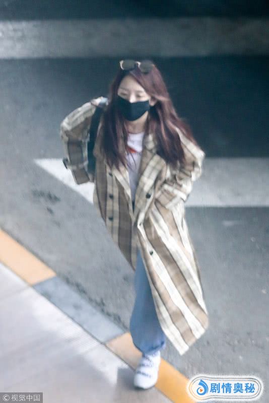 孟美岐内搭白色T恤,外套而是一件拖地长款的格子风衣,走起路来衣摆带风,头上架着墨镜,戴着黑色口罩,相当有范。