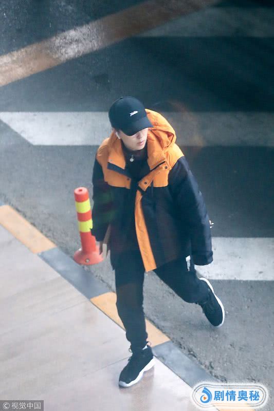 杨芸晴依旧打扮帅气,黑色带有桔色的大外套,配上黑色帽子,戴着白色的蓝牙耳机,脚步匆匆。