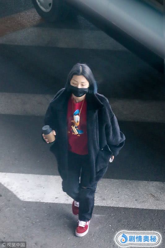 最后来看看队长yamy,黑色T恤配红色鞋子,给黑色的外套添了几分亮色,右手拿着咖啡,也是脚步匆匆,期待火箭少女3月30日的广州演唱会。