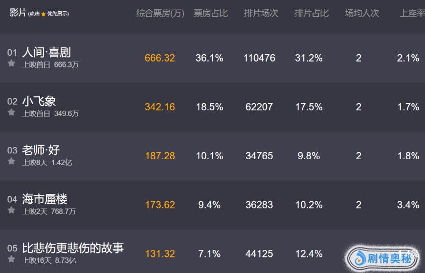 由艾伦,王智主演的《人间·喜剧》暂时力压群雄夺得票房冠军。截至29号9点《人间·喜剧》拿下了666万的日票房,排片为31.2%,票房占比36.1%。这样的票房开画数据并不算优秀,但在目前内地市场缺乏对观众有吸引力的大片情况下,《人间·喜剧》恐怕是新片中唯一有希望破亿的电影了