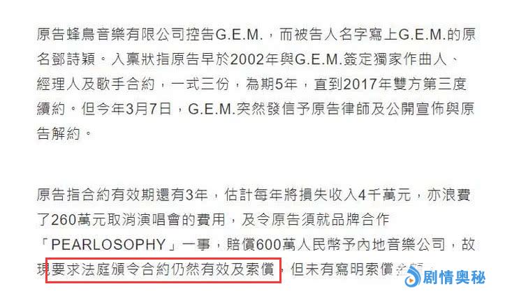 邓紫棋单方面提出和经纪公司解约后,蜂鸟公司不同意解除合约,并且直接把邓紫棋起诉到香港高等法院。蜂鸟公司声称和邓紫棋的合约时间还有3年,每年损失4000万,算上其它相关费用,蜂鸟认为目前损失约在1.2亿港币(约1亿人民币)。蜂鸟公司要求法院判定合约继续生效,同时要求邓紫棋赔偿损失。