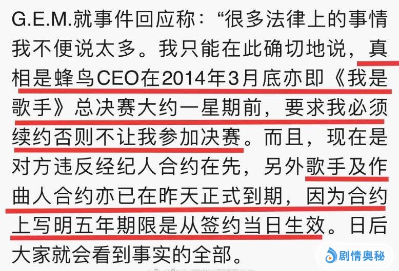 邓紫棋本人也回应了这件事,邓紫棋说很多法律上的事情她不方便说,她表示蜂鸟公司曾经强迫自己续约,否则就不让邓紫棋参加《我是歌手》总决赛。同时,邓紫棋指出是公司先违反经纪人合约,她也放出狠话说绝对不退缩,法庭上见。