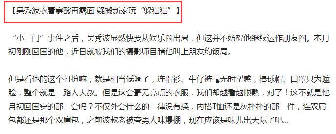 据摄影师透露说,吴秀波这套衣服看起来很熟悉,似曾相识,与月初回国那一身衣服是一样的,外套和T恤都没换,显得有些寒酸啊!