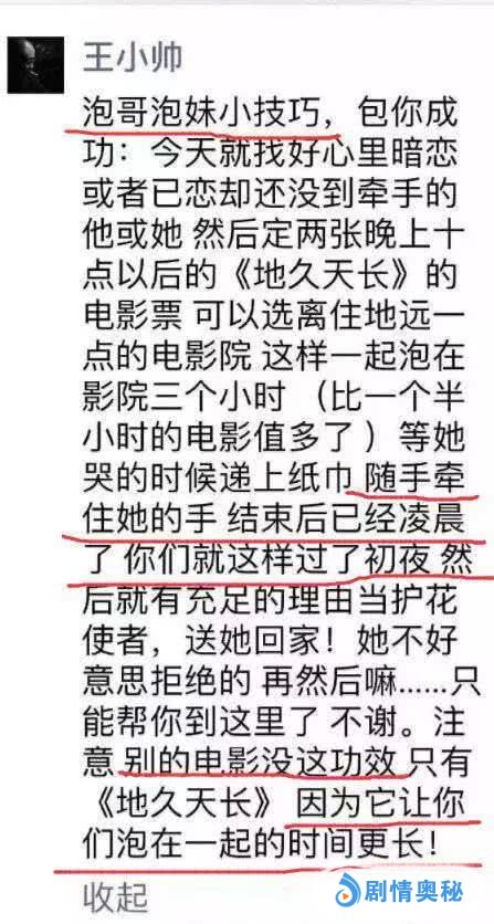 更有意思的是,王小帅这条朋友圈把方法和技巧都说出来了,要找十点以后的场,观影过程中牵着她的手,电影结束已经凌晨了。
