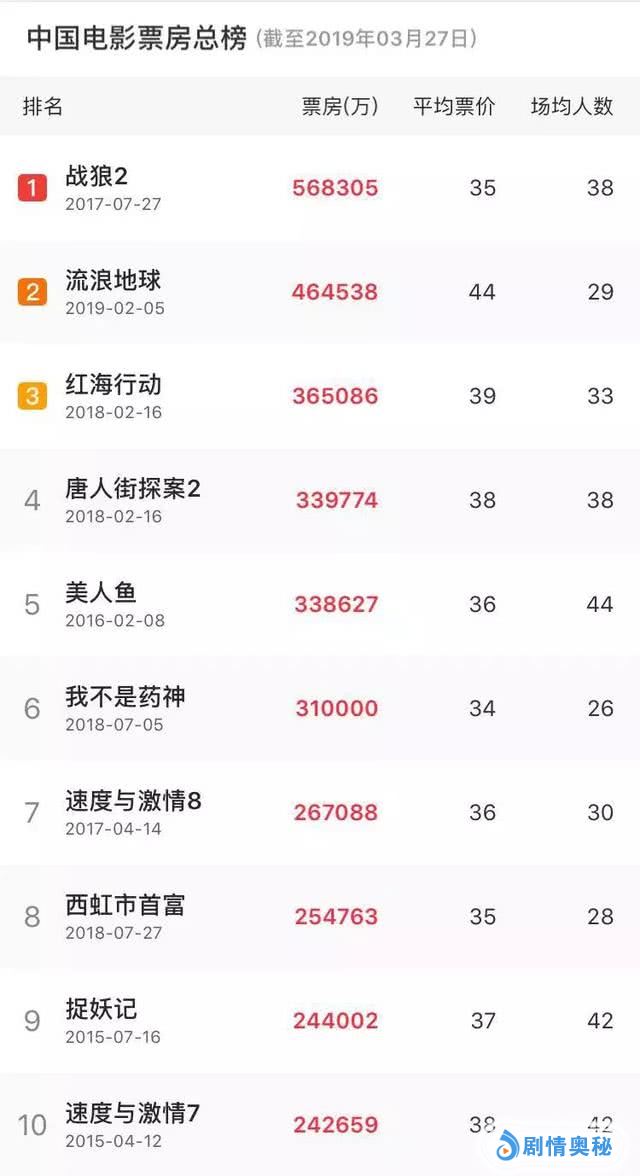 岂止是前十,国内电影票房榜前三十部电影,也仅仅只有排在第三十位的《芳华》是文艺片。