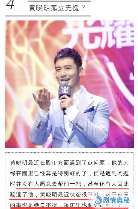 3月29日,有资深娱记报道说黄晓明孤立无援!该娱记发文:黄晓明最近在股市方面遇到了点问题,他的人缘在圈里已经算是特别好的了,但是遇到问题时并没有人愿意去帮他一把,甚至还有人因此疏远了他。