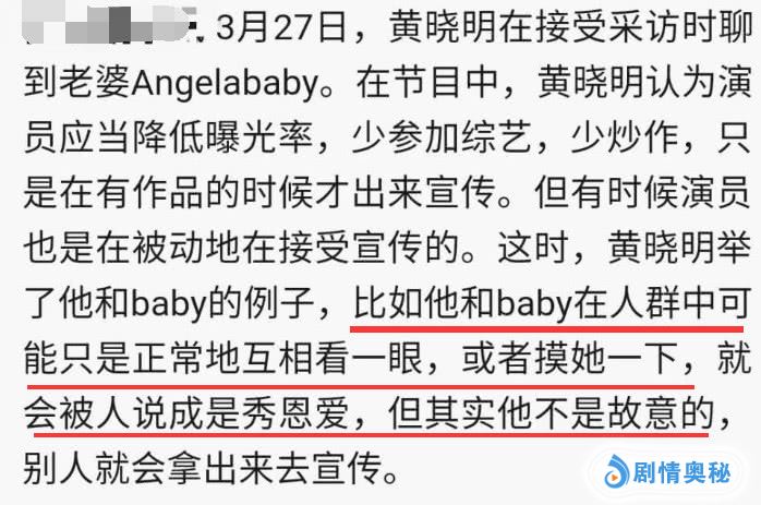 黄晓明拿自己举例子,他和妻子baby在人群中正常互相看一眼,或摸一下baby,就会被别人说是秀恩爱,但这不是黄晓明故意的。因此,黄晓明对家庭问题特敏感,不愿意多说家庭问题也是可以理解的,内心压力很大。