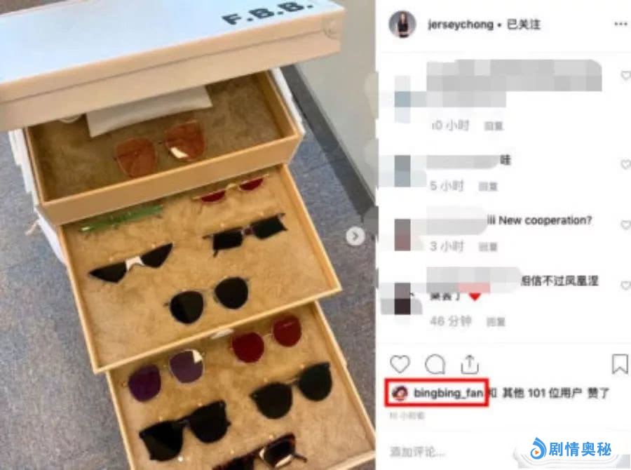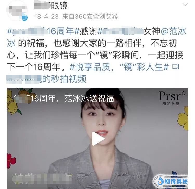 有眼尖的网友发现,范冰冰工作室国际公关总监张馨灵,在社交平台上晒出范冰冰代言的墨镜产品照片,并写道:“thanks for the love.”