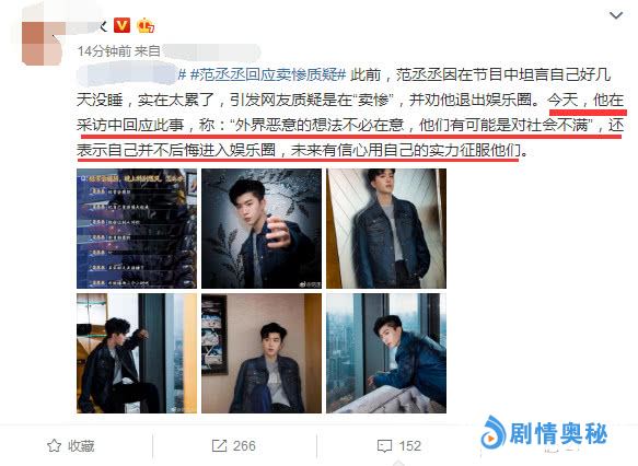 范丞丞曾经在采访时抱怨自己很忙很累,说好几天没睡觉了,还说一天只睡觉两三个小时,实在是撑不下去了。当时不少网民纷纷留言说范丞丞卖惨,还说既然感觉很累,干脆退出娱乐圈算了,不要做明星了。总之网上对他的评价很多都是负面的,质疑他故意卖惨。范丞丞本人终于开口回应了!