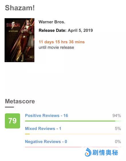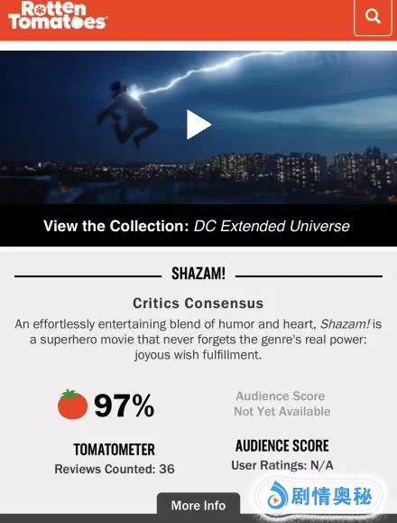 口碑解禁后的《雷霆沙赞》受到了媒体的极力称赞,MTC17家媒体综评79分,烂番茄新鲜度97%!两项数据均创造DC电影新高!
