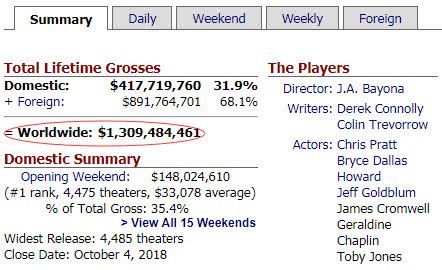 在多个市场共同发力下,《侏罗纪世界2》在全球吸金13亿美金(约合87亿人民币),轻松击败《海王》,利润超过2亿美金,这部顶级大片果然强悍!